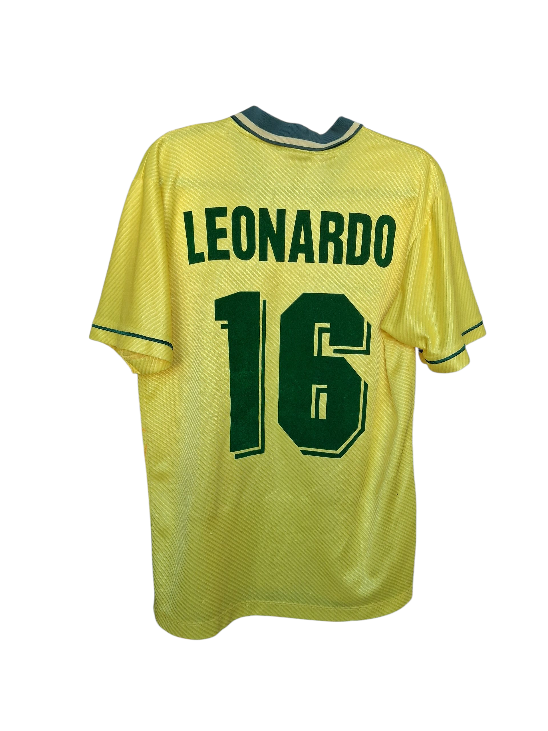 Maillot domicile du Brésil, floqué de l'ancien Parisien Leonardo (feutrine).Un modèle exceptionnel d'autant que les Brésiliens remporterons la coupe du monde.