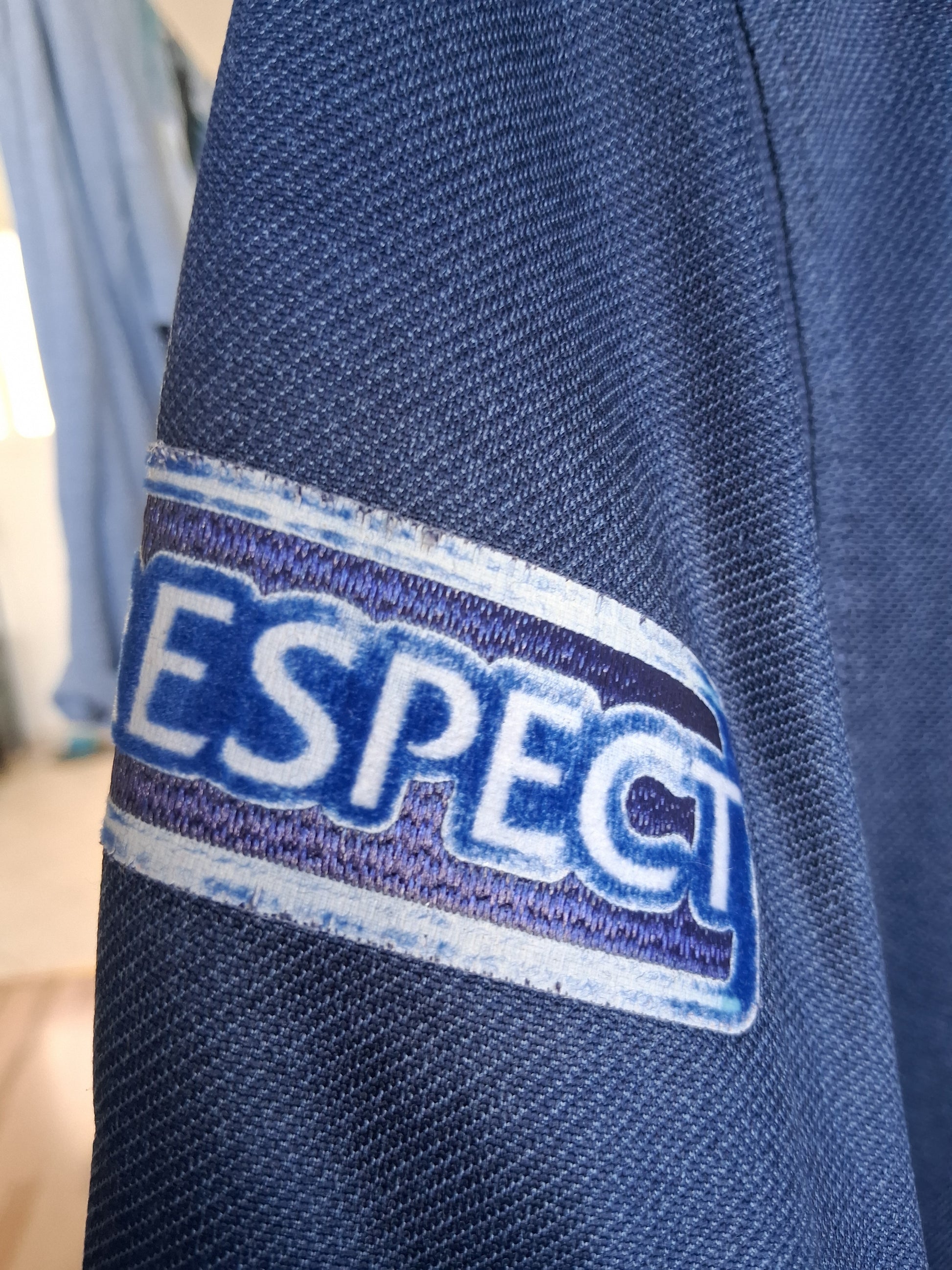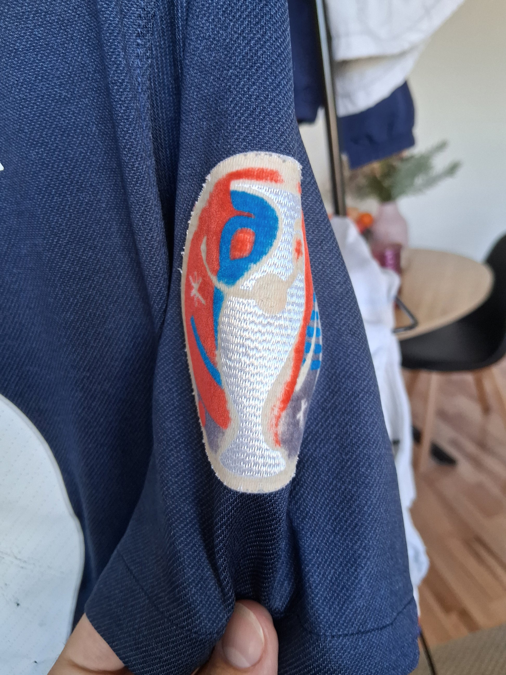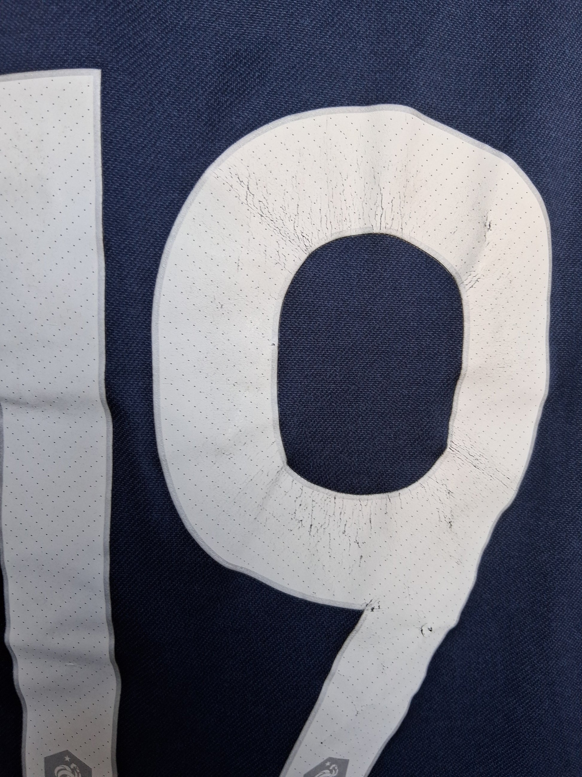 Le tissu est en bon état, le flocage au dos est craquelé et les patchs sont usés.